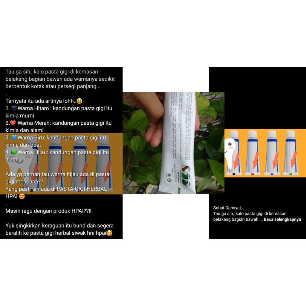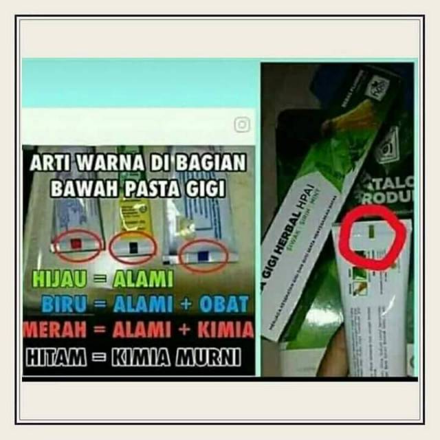 Menurut postingan tersebut strip hijau di kemasan pasta gigi berarti pasta gigi terbuat dari bahan 100 herbal alami. Kabarnya warna ini mengindikasikan kandungan pasta gigi tersebut. Pada pasta gigi yang sering kita gunakan ternyata ada tanda warna pada kemasannya.