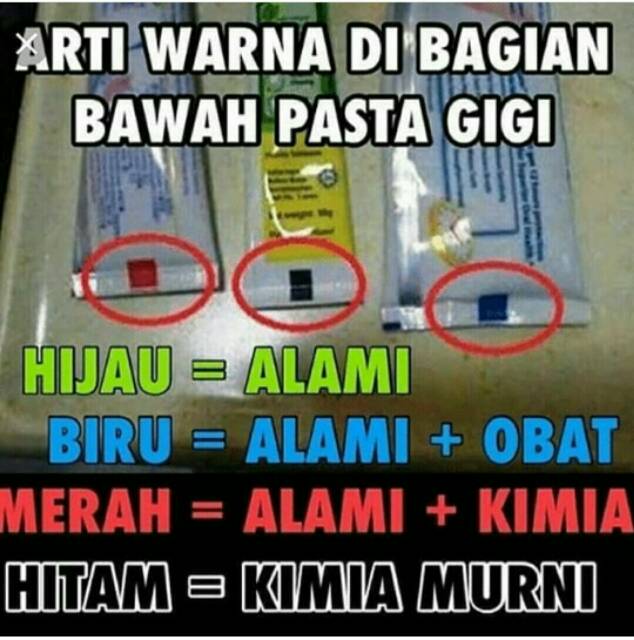 Arti warna hitam pada pasta gigi. Menurut kabar yang beredar arti dari kode warna pada kemasan pasta gigi diantaranya adalah. Jakarta belum lama ini tersebar pesan broadcast yang mengatakan bahwa kode warna dalam kemasan pasta gigi memiliki arti kode yang dimaksud adalah kotak kecil berada di pinggir kemasan. Kode di balik kemasan pasta gigi ini menunjukan kandungan yang terdapat dalam pasta gigi tersebut.