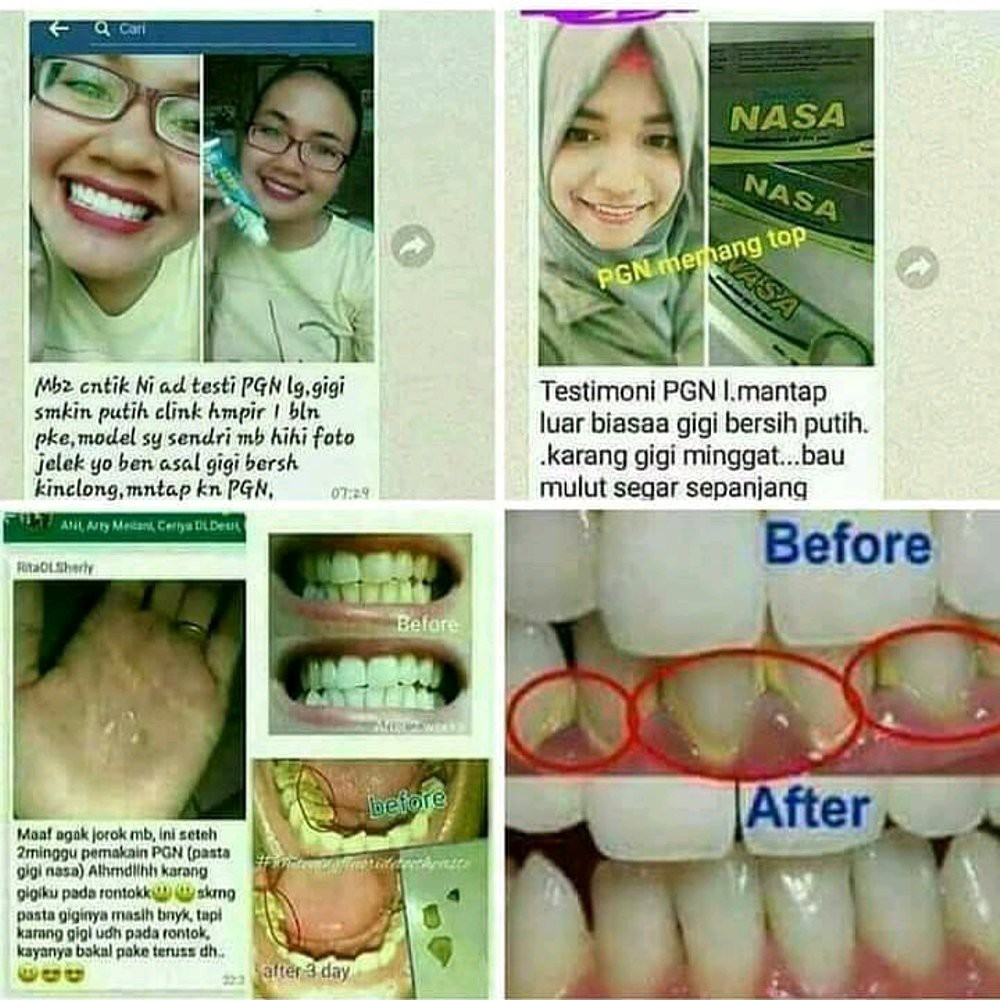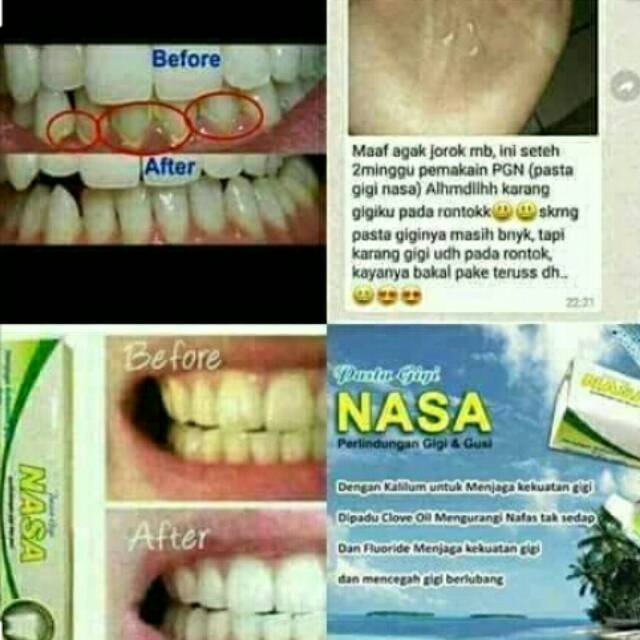 Semua jenis bahan ini sangat penting untuk menipiskan lapisan karang dan membunuh semua bakteri di mulut. Solusi untuk kamu yang sedang mengalami permasalahan pada mulut atau gigi ialah dengan mencoba produk nasa. Selain bisa membuat gigi menjadi putih pasta gigi ini juga bisa menghilangkan berbagai noda pada gigi termasuk plak dan karang gigi.