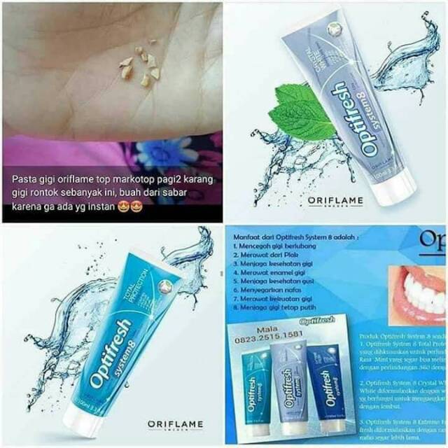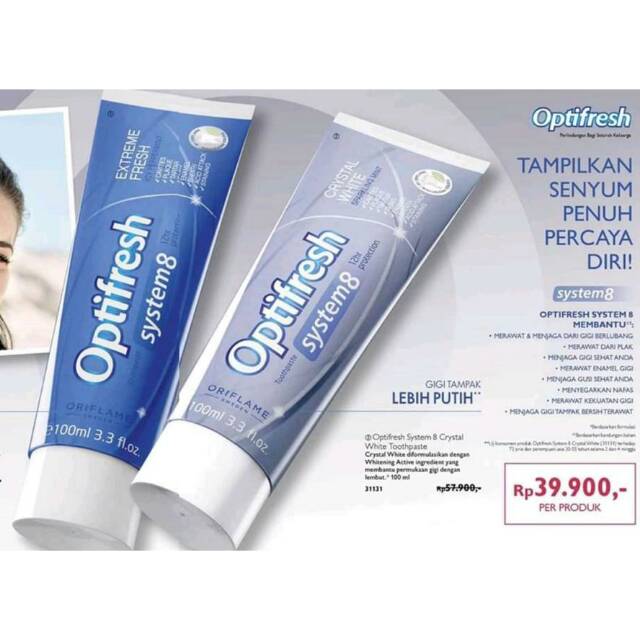 Menyikat gigi dengan pasta gigi optifresh system 8 baru adalah cara sederhana untuk membantu menjaga senyum anda tampak segar bersih dan indah. Anda bisa mencari produk ini di toko online yang mungkin jual pasta gigi optifresh system8. Terdapat dua jenis utama perawatan mulut oriflame yaitu pasta gigi oriflame dengan kelebihan dan kekurangan masing masing.