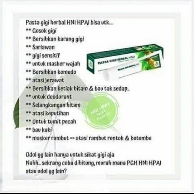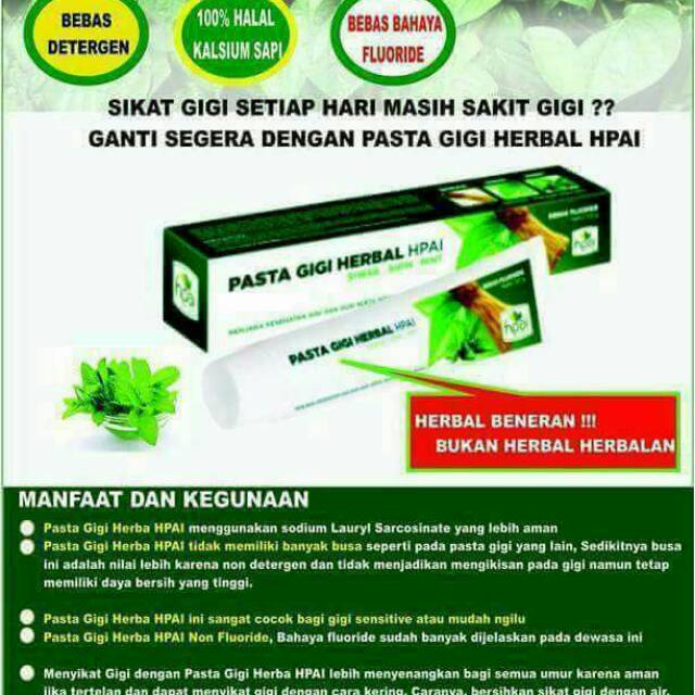 Kegunaan pasta gigi hni. Pasta gigi herbal hpai tidak mengandung fluoride. Pasta gigi herbal hpai tidak mengandung fluoride. Pasta gigi herbal hpai terbuat dari bahan siwak pilihan dan disinergikan dengan ramuan warisan nenek moyang nusantara yang telah terbukti berabad silam yang lalu sehingga menjadikan pasta gigi hpai yang bukan hanya bermanfaat membersihkan namun juga menyehatkan dan memelihara gigi gusi dan kesehatan mulut.