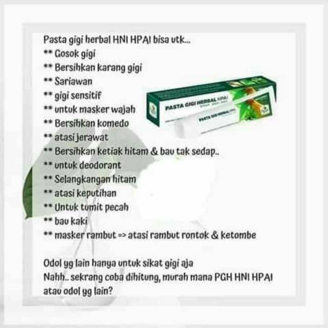 Manfaat pasta gigi herbal hpai untuk jerawat. Pasta gigi herbal hpai ini sangat cocok untuk gigi sensitive atau mudah ngilu seperti pasta gigi yang banyak beredar di pasaran. Fakta perawatan jerawat dengan pasta gigi. Pasta gigi juga mengandung silika yang akan berperan.