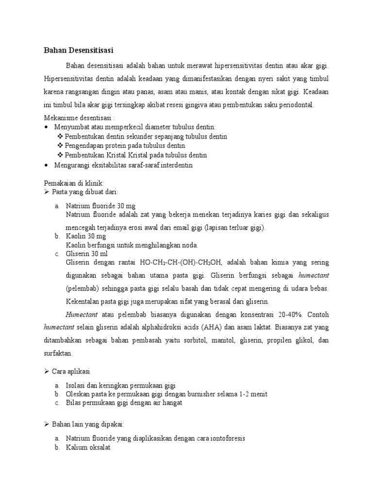 Bahan desensitisasi yang digunakan dalam pasta gigi adalah sebagai berikut. Hipersensitivitas dentin adalah keadaan yang dimanifestasikan dengan nyeri sakit yang timbulnya karena rangsangan dingin atau panas asam atau manis atau kontak dengan sikat gigi. Bahan terapeutik yang biasa ditambahkan dalam pasta gigi adalah flour bahan desensitisasi bahan anti tartar bahan antimikroba bahan pemutih bahan pengawet anonim 2010.