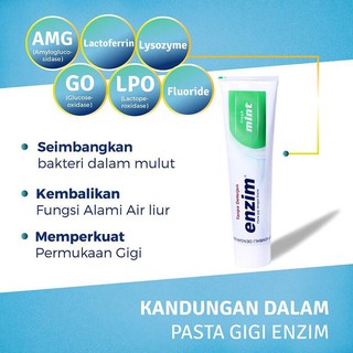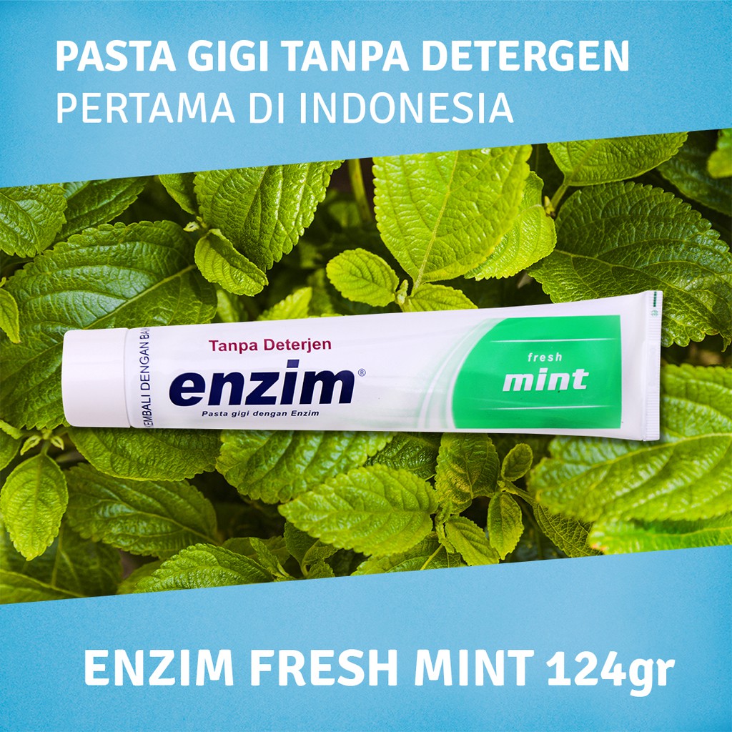 Enzim pasta gigi fresh mint 124g merupakan pasta gigi tanpa deterjen yang mengandung enzim bermanfaat mengembalikan kualitas air ludah dalam mengontrol keseimbangan bakteri rongga mulut sehingga dapat membantu mengatasi sariawan dan bau mulut serta mencegah kekambuhannya. Dengan begitu mulut terhindar dari permasalahan yang cenderung menyerang mulut dan gigi seperti gigi berlubang penipisan email gigi dan mengurangi nyeri pada gigi sensitif. Satu satunya pasta gigi tanpa detergen yang mengandung enzim aktif adalah pasta gigi enzim fresh mint.