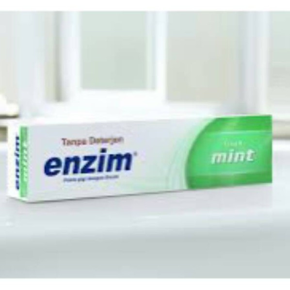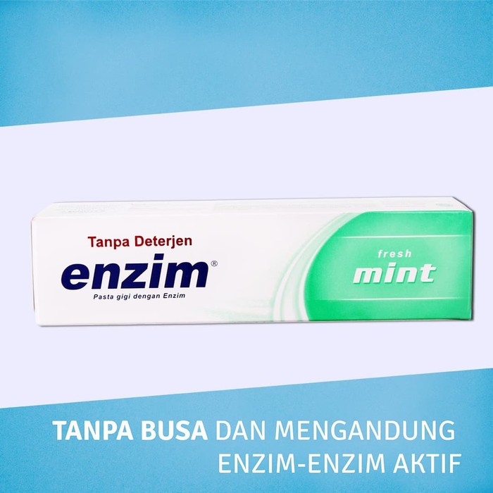 Pasta gigi enzim mint mengandung zat aktif enzyme yang berfungsi sebagai pelindung fungsi alamiah dari air ludah yaitu untuk mengendalikan pertumbuhan bakteri. Enzim fresh mint merupakan pasta gigi yang mengandung 5 enzim natural aktif.