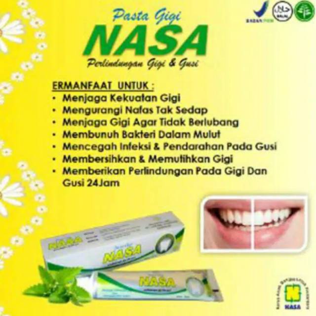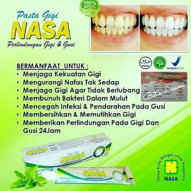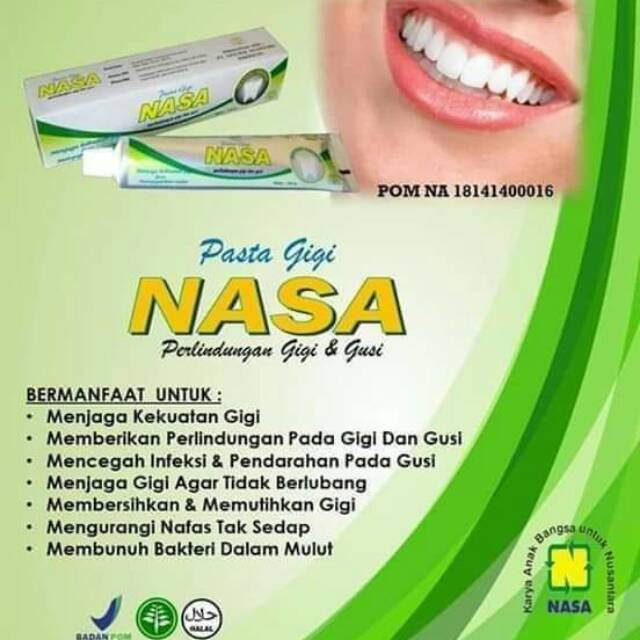 Pasta gigi nasa membersihkan karang gigi. Bahkan ada pasta gigi nasa perontok karang gigi. Pasta gigi nasa merupakan pasta gigi yang insya alloh bermanfaat untuk mengatasi keluhan pada gigi seperti karang pada gigi dan gigi berlubang. Membuat gigi tampak lebih putih 3.
