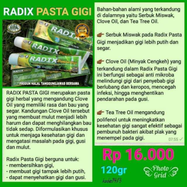 Pasta gigi radix hpa. Pasta gigi radix hpa adalah produk herbal halal yang di formulasi bagi tujuan kesehatan dan kebersihan gigi dan terbukti berkhasiat. Keilmuan warisan zaman berzaman. Pasta gigi radix 2 in 1 luar biasa merdeka silakan menikmati khazanah ubatan herba 2 in 1.