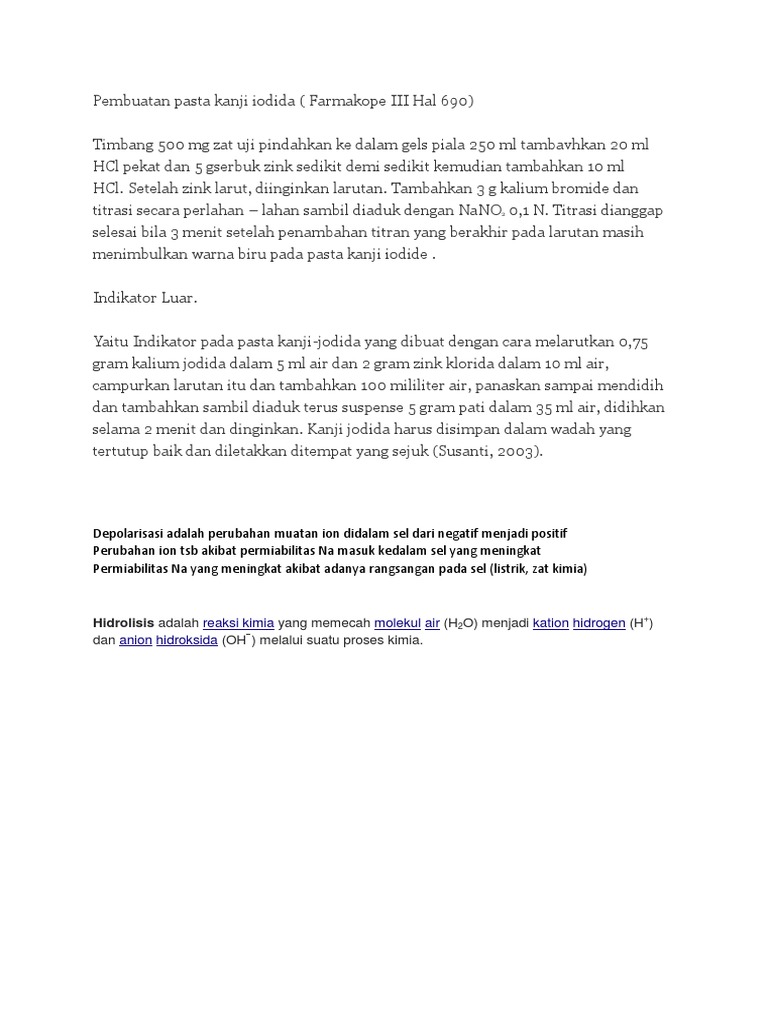 Pasta kanji iodida adalah. Metode titrimetri dapat juga dilakukan dengan n n dibromodimetilhidantoin gandjar dan rohman. Ketika larutan digoreskan pada pasta kanji iodida adanya kelebihan asam nitrit akan mengoksidasi iodida menjadi iodium dan dengan adanya kanji atau amilum akan menghasilkan warna biru segera. Larutan baku yang digunakan adalah larutan i 2 0 1 n dan na 2 s 2 o 3 yang akan direaksikan dengan suatu asam sebagai katalisator.
