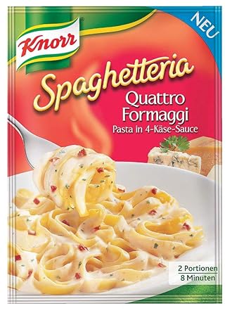 Ingredients knorr spaghetteria pasta quattro formaggi. Nutritional information per 100g knorr spaghetteria pasta quattro formaggi energie 510kj 120kcal fett 3g davon gesättigte fettsäuren 2g kohlenhydrate 19g davon davon zucker 1g ballaststoffe 0 9g eiweiß 4g salz 0 88g.