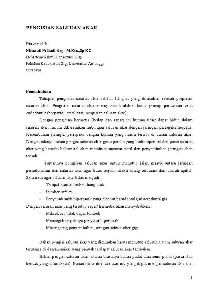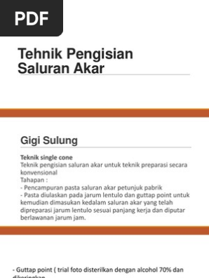 Perawatan saluran akar adalah perawatan yang paling banyak dilakukan dalam kasus perawatan endodontik. Perawatan saluran akar dapat dibagi atas tiga tahap utama yaitu. Pengisian saluran akar bertujuan untuk memberikan penutupan yang sempurna dalam saluran akar akbar 2003.