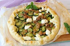 Pasta sfoglia con zucchine e tonno. Srotola il rotolo di pasta sfoglia e adagialo in una teglia tonda del diametro di circa 30 cm senza toglierla dalla carta oleata in cui è avvolta e facendola aderire bene al fondo e alle pareti. Farcire con le fettine di prosciutto cotto le zucchine grattugiate il tonno ben sgocciolato e la scamorza tagliata a fettine. Dopo aver aggiunto nella teglia le olive denocciolate aggiungete il composto a base di panna.