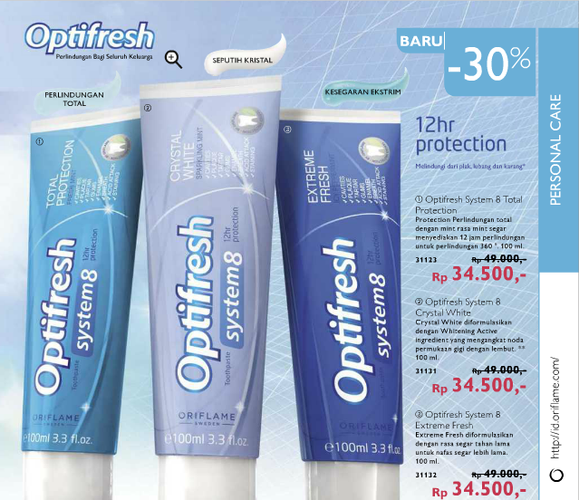 Aqua hydrated silica sorbitol glycerin peg 12 sodium lauryl sulfate aroma cellulose gum tetrapotassium pyrophosphate titanium. Anda sekeluarga bisa menggunakan produk persembahan oriflame ini jika ingin memperoleh nafas segar dan senyum indah setiap hari. Optifresh yang diproduksi perusahaan oriflame memiliki kandungan flouride hanya mencapai 0 1 flouride 1000 ppm dan untuk pasta gigi anak anak hanya 500 ppm selain itu oriflame merupakan perusahaan besar yang berasal dari swedia negara yang memberi batasan dalam penggunaan fluoride dalam pembuatan pasta gigi selain itu produk oriflame di import dan dipasar luaskan di beberapa negara.